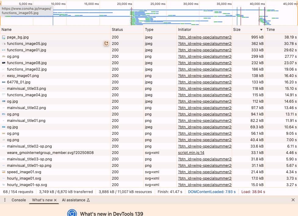 画像軽量化対応の結果、ページの読み込み時間 が約39秒から約24秒(約15秒短縮)し、転送データ量も6,870 KB → 4,102 KB(約40%削減)しました🥳