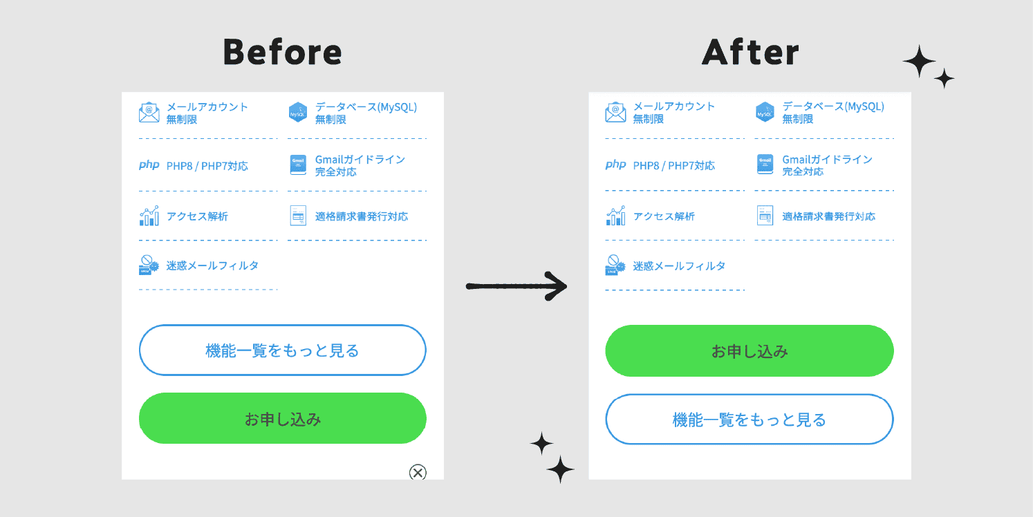 「お申し込みボタン」と「機能一覧をもっと見る」などの詳細ボタンですが、実は改善前のサイトではお申し込みボタンが下に配置されていました…!