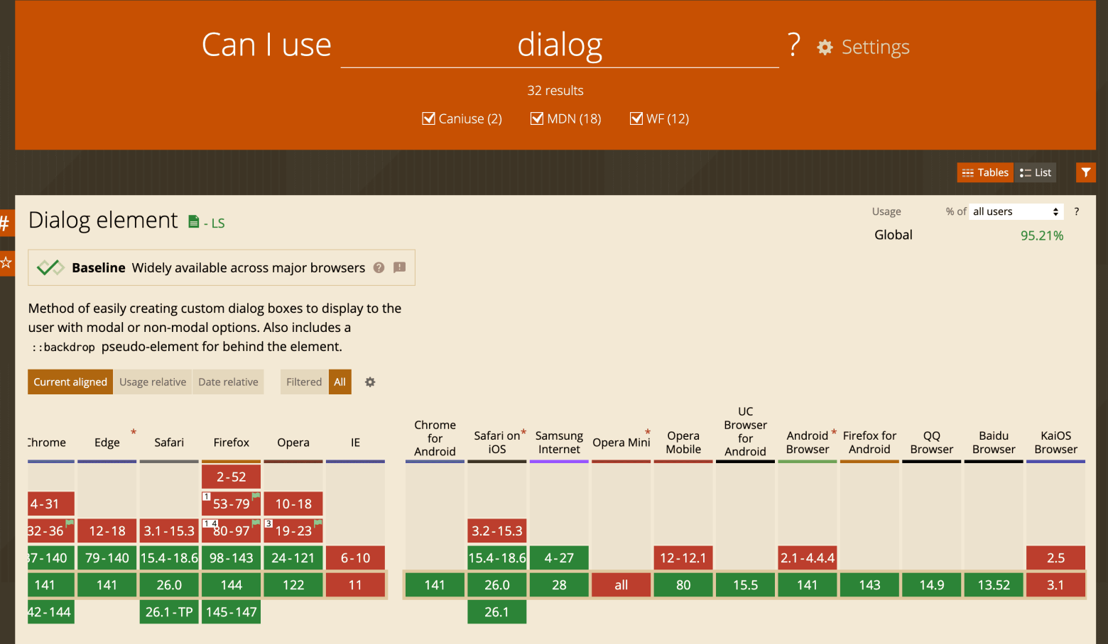 showModal()とclose()メソッドを呼び出すだけで開閉でき、ESCキー対応やフォーカス制御などの基本機能も標準で備わっています。