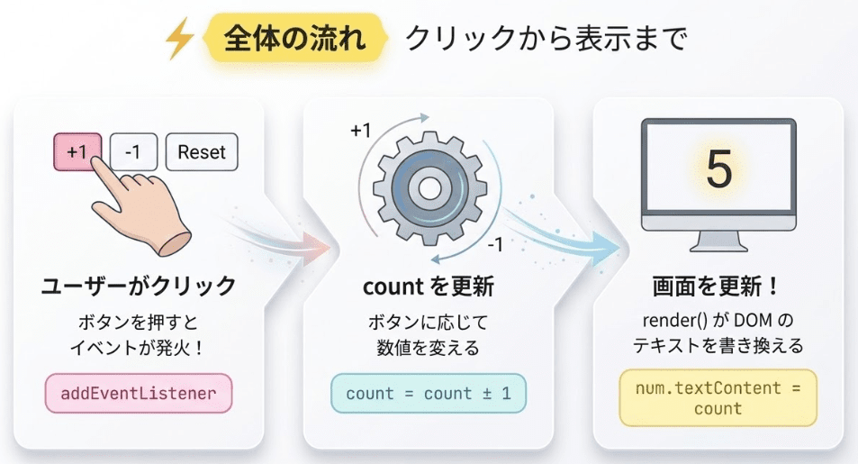 これで、クリック → count更新 → render()で表示更新、という流れが完成です。