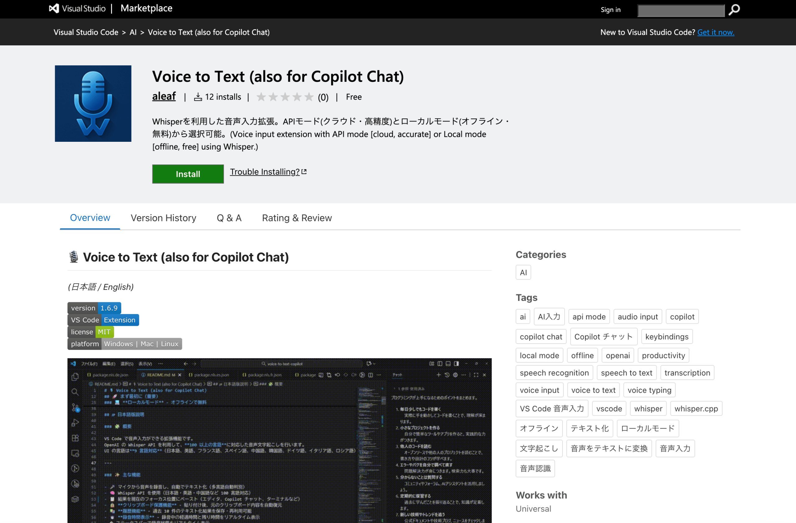 そんな訳で、仕事でもプライベートでも使っているVS CodeのAIアシスタント—Copilotでも同じように音声入力したいと常々思っていたのですが、マイクロソフト公式が出している音声入力の拡張機能「VS Code Speech」をインストールして話してみても出力されるのは私が話した日本語の発音に似た英単語の羅列。もちろん意味をなしていません。