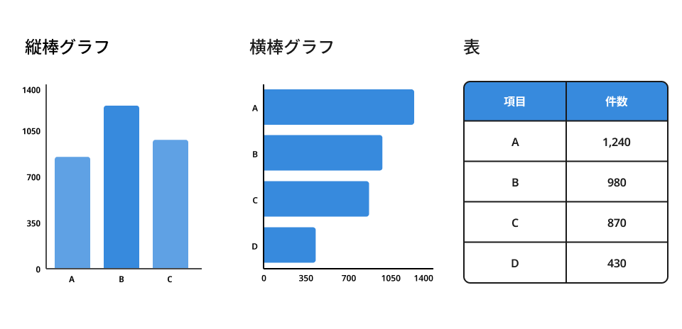 基本的な役割は縦棒と同じですが、項目が多いときやラベルの文字数が長いときに向いています。横向きなのでラベルが読みやすく、ランキング形式で見せたいときにもしっくりきます。「ユーザーが挙げた不満TOP10」のように項目名が長い場合は、縦棒より横棒の方がずっとすっきり見えます。