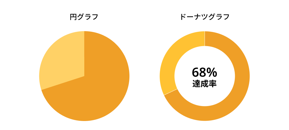 円グラフと基本的な使い方は同じですが、中央に数値やテキストを入れられるのが特徴です。「達成率68%」のように、注目してほしい数値を中央に大きく表示したいときに活躍します。アプリの管理画面や社内レポートで、達成率や完了数を表示するときによく見かける形ですね。