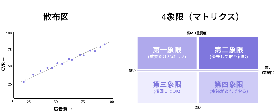注意したいのが、4象限は「感覚や意見を整理する」ための道具だということ。数値データがあるなら散布図の方が向いています。また、軸の意味は具体的に決めておくのがポイント。「良い・悪い」のような曖昧な言葉より、「重要度・実現性」のように誰が見ても同じ基準で判断できる言葉を使いましょう。