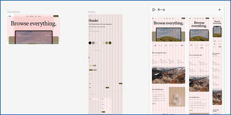 実際に開いてテンプレートを見てみると、コンポーネントやスタイルがまとめられていたり、表示デバイスごとのデザインが並べられているのでデザインの全体像がわかりやすく、勉強になりそうだなというのが第一印象です。