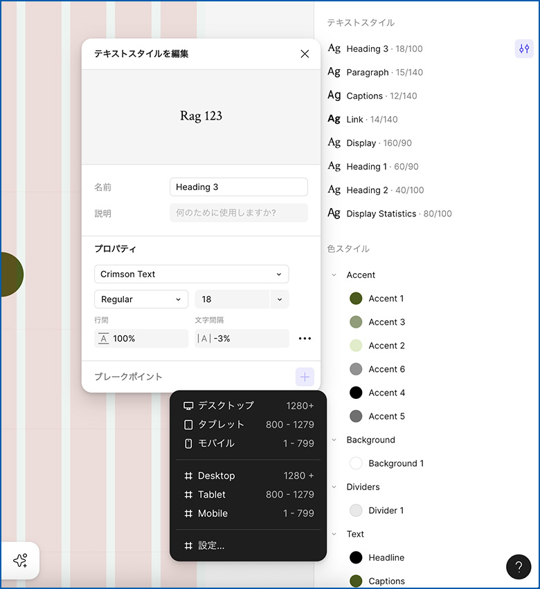 スタイル自体は、Figmaデザインの方にもある機能なのですが、Sitesの方ではデスクトップ・タブレット・スマートフォンのブレイクポイントに応じてそれぞれ設定を変えることができるんです。