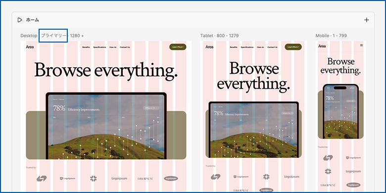テンプレートでは、デスクトップ・タブレット・スマートフォン用のアートボードに、それぞれ対応したデザインが入っています。
