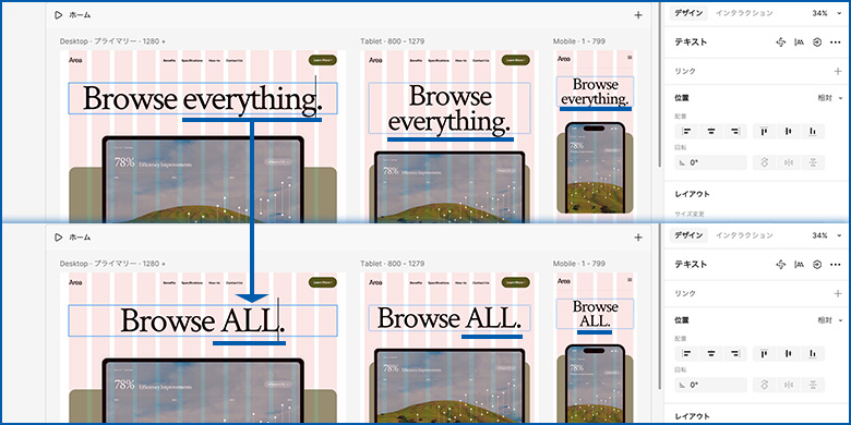 テンプレートの状態からテキストを変えようとして、デスクトップアートボード内の該当部分を選択して変更すると、他ブレイクポイントの同じ部分も同時に変更してくれます。