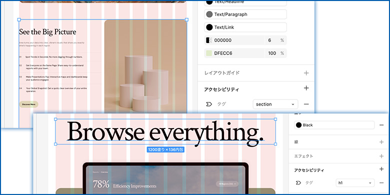 テキスト変更だけでなく、アニメーションやインタラクション(Figmaデザインでのプロトタイプ)、後述するアクセシビリティもマッチングされていて、作業の大幅な時短になりそうです。