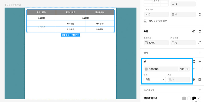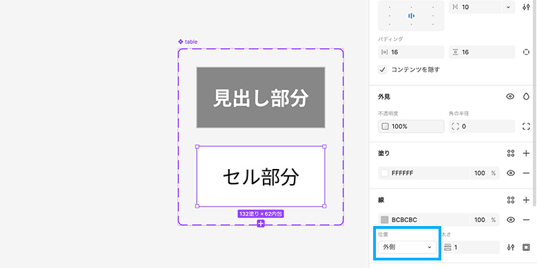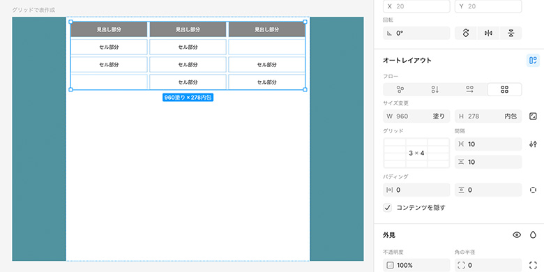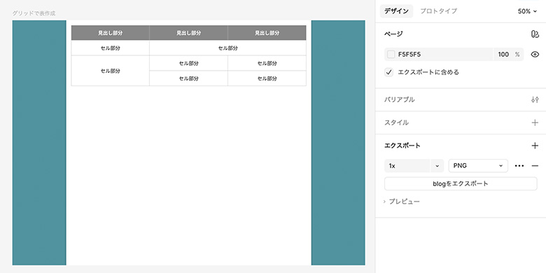 表を作成する前に、見出し部分とセル部分のデザインをコンポーネントにしておきました。こうすることで、全体のデザインを変更する時にも楽になります。