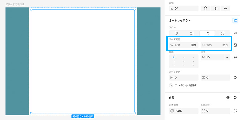 グリッド機能を使いやすくするために、まずは幅を固定したフレームを作成します。幅が固定されたフレームがあることで、その中にあるフレームでサイズを「コンテナに合わせて拡大」設定にすることができるようになります。