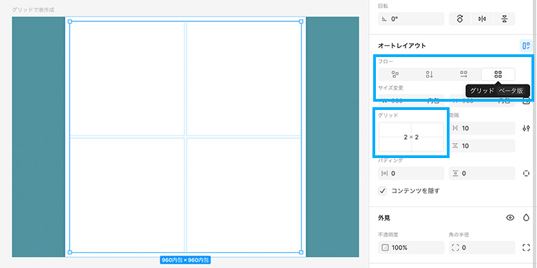 フレームのフロー設定の中に「グリッド」はあります。こちらを選択することで、自動的に2×2のマスがフレームの中に作られます。