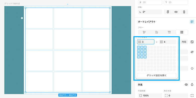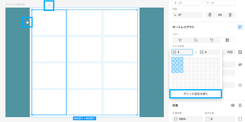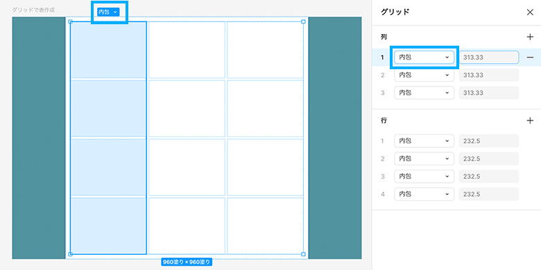それぞれの枠にもオートレイアウトが適用されていて「内包」や「拡大」、固定の数値を指定することができます。表の上部または左部の水色丸や、ポップアップ下の「グリッド設定を開く」からまとめて設定できます。列は「拡大」、行は「内包」を指定しておくと意図しない崩れが出にくくなります。
