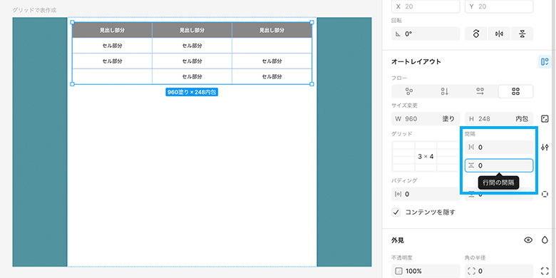 また、セルをコンポーネントにしているのでアレンジも自由です。例えば、間隔に数値を入れ隙間を作り、コンポーネントの線を消して塗りに色をつければ、まったく違った印象の表にすることも可能です。自分のデザインにあった表を作成してみてください。