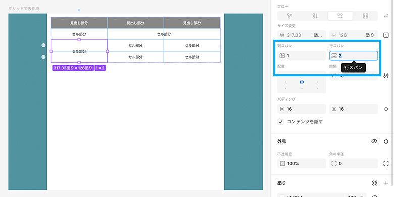 そして、スパンの部分を整えていきます。結合する予定のセルの中でコンポーネントを入れている方を選択すると、右のオートレイアウトエリアに「列スパン」「行スパン」という項目が増えますので、該当する方の数字を入力することで、セルが連結した形にすることができます。