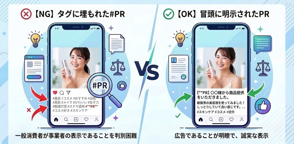 クリエイターに関わりが深いのは、主に「不当表示の禁止」というルール。たとえ作り手に悪意がなくても、結果としてユーザーが「実際よりも著しく良い」と誤認してしまえば、法律違反の対象となる可能性があります。