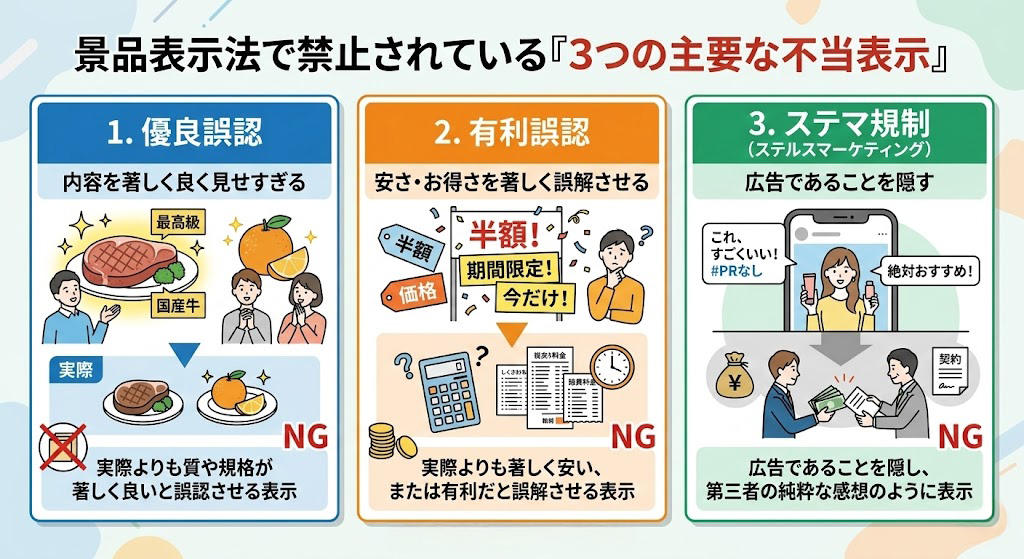 景表法の中でも、特にデザイン表現に直結するのが以下の3つです。