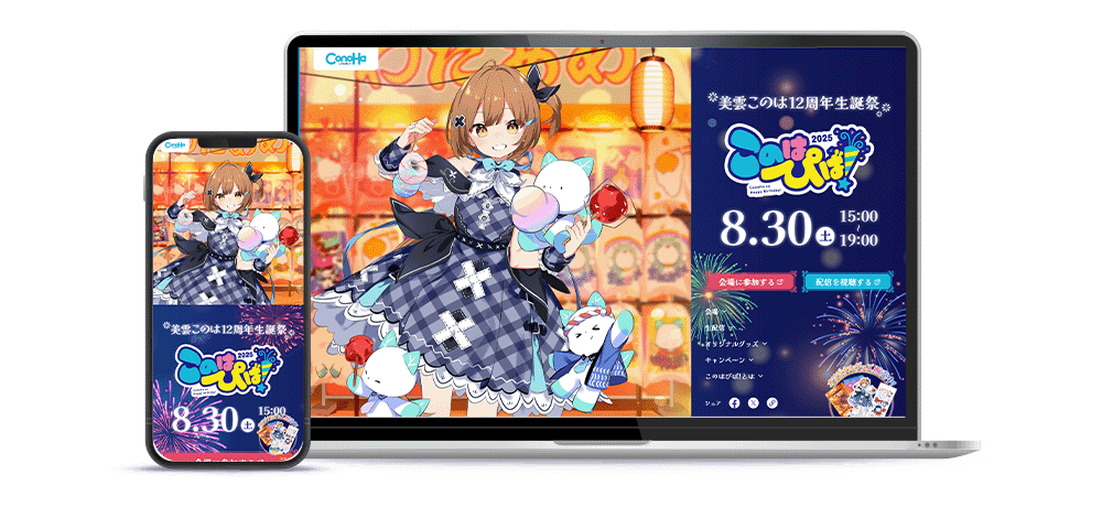 『このはぴば!』とは、GMOインターネット株式会社が提供しているレンタルサーバーサービス『ConoHa byGMO』の応援団長である美雲このはちゃんの応援団長就任を記念して毎年開催されているイベントです。また、2025年はレンタルサーバーサービス『ConoHa byGMO』のサービス開始から12周年にあたる年でもあり、日頃応援してくださっている皆様への感謝の気持ちを込めて今年も生誕祭イベントが盛大に開催されました。