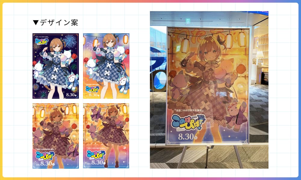 自分が制作に関わったグッズやポスターが実際に会場で使われ、来場者の皆さんに楽しんでいただけている様子を見られたことは、デザイナーとして本当に嬉しい瞬間でした。