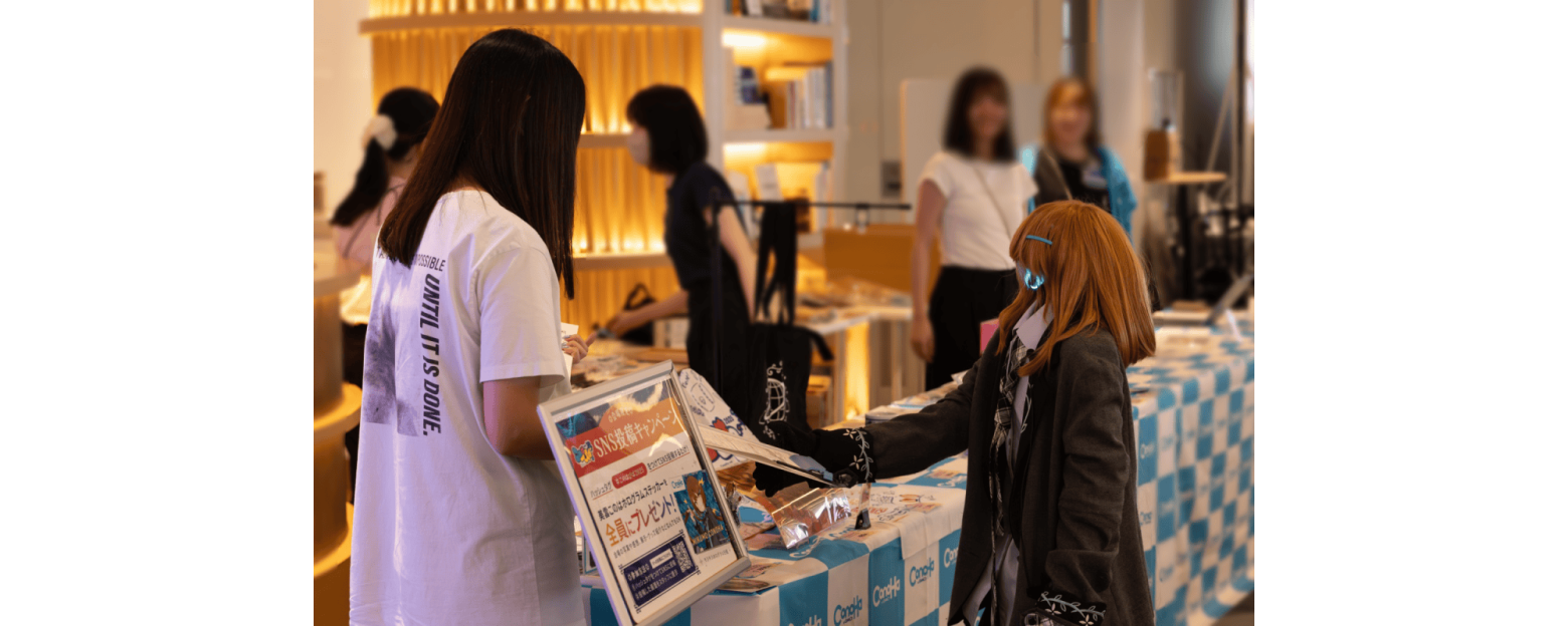 SNS投稿キャンペーンの宣伝などをしていたのですが、ちょうど近くにアクリルスタンドが置いてあり、お客様が手に取ってくださる光景に立ち会えて、感激しました✨