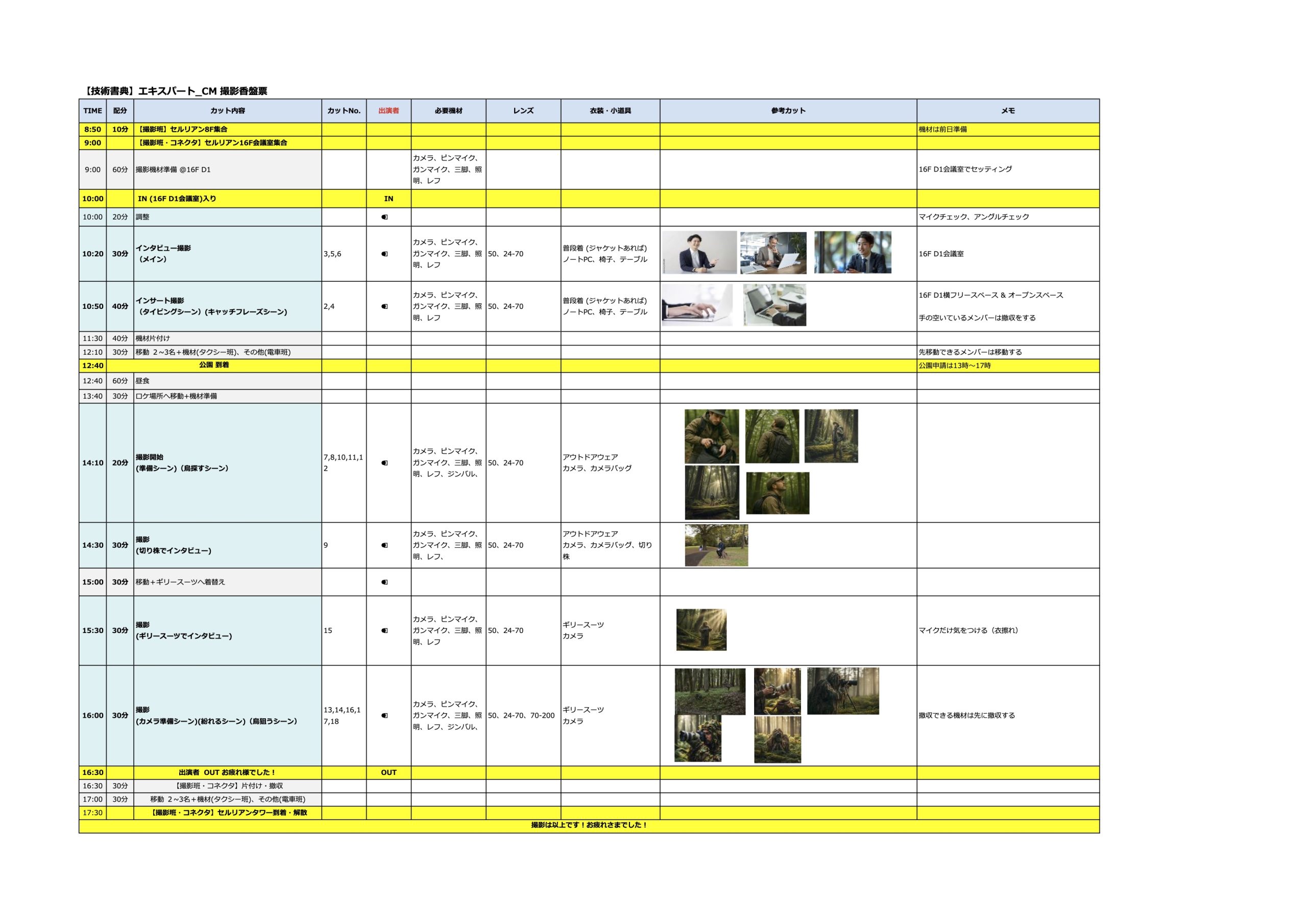 ここを1つずつ整理し、香盤表や人員配置の資料を作りながら準備しました。