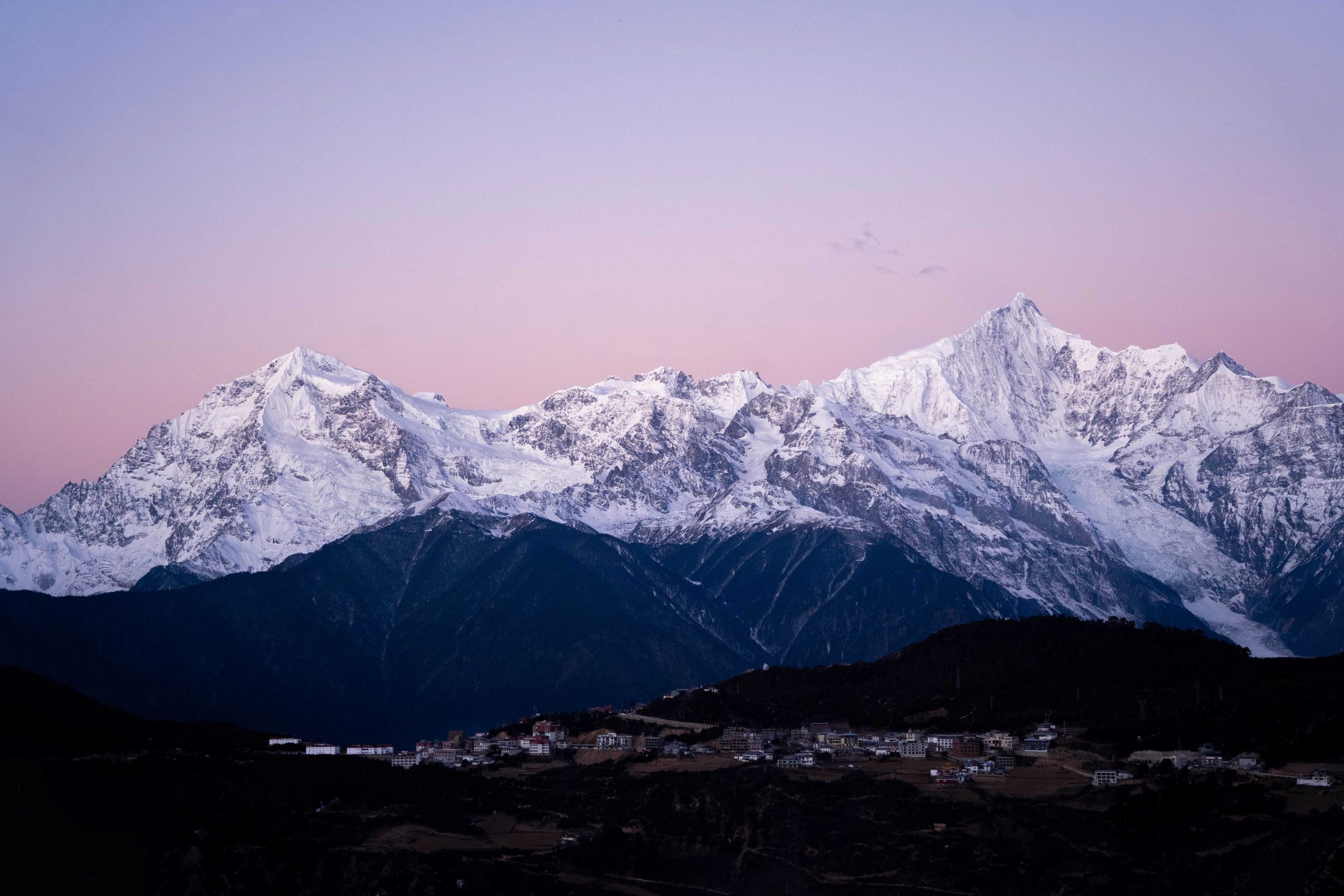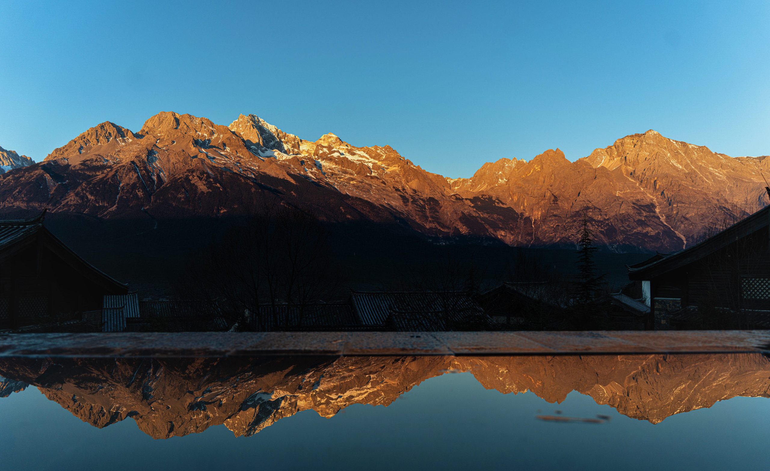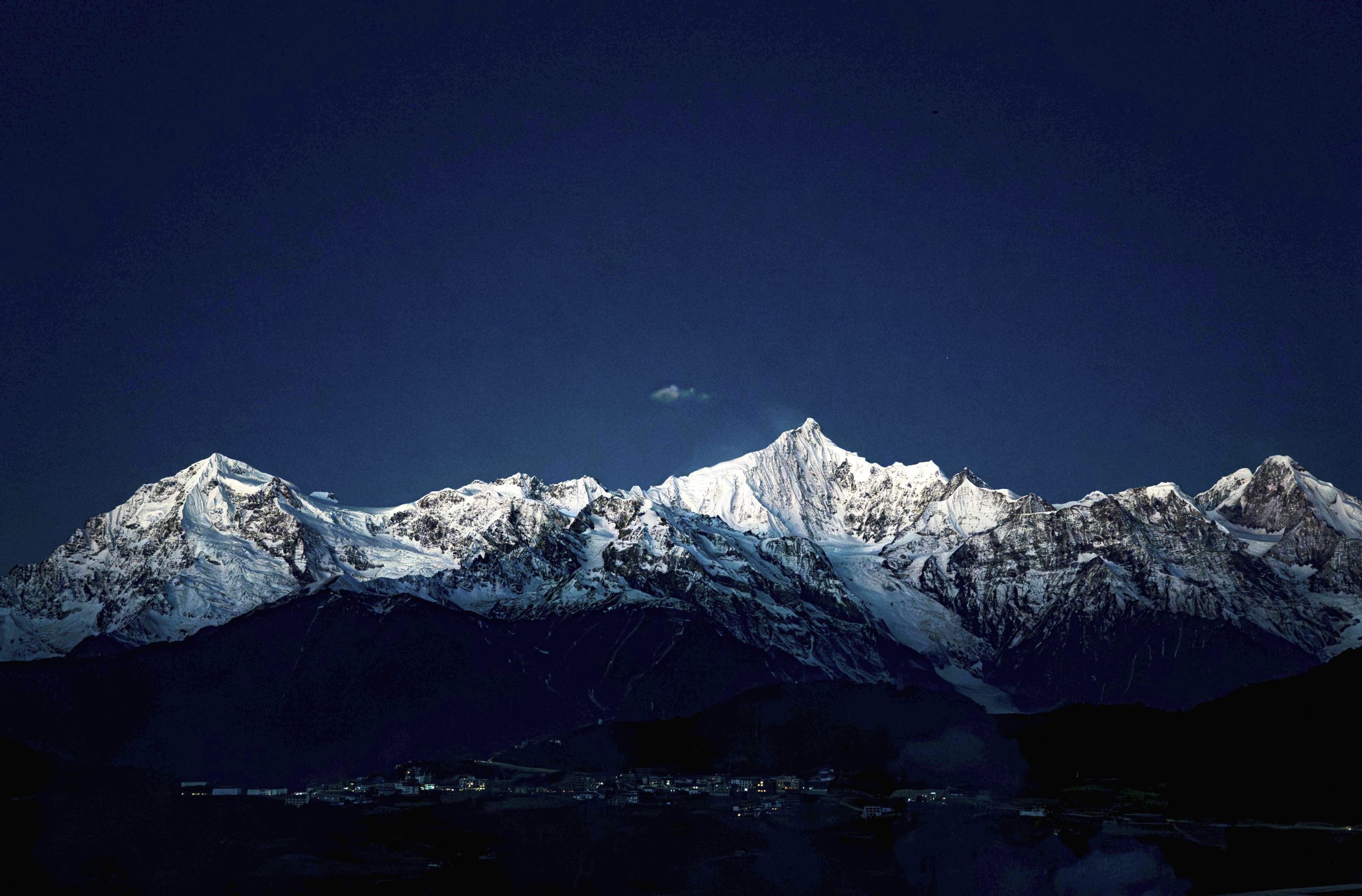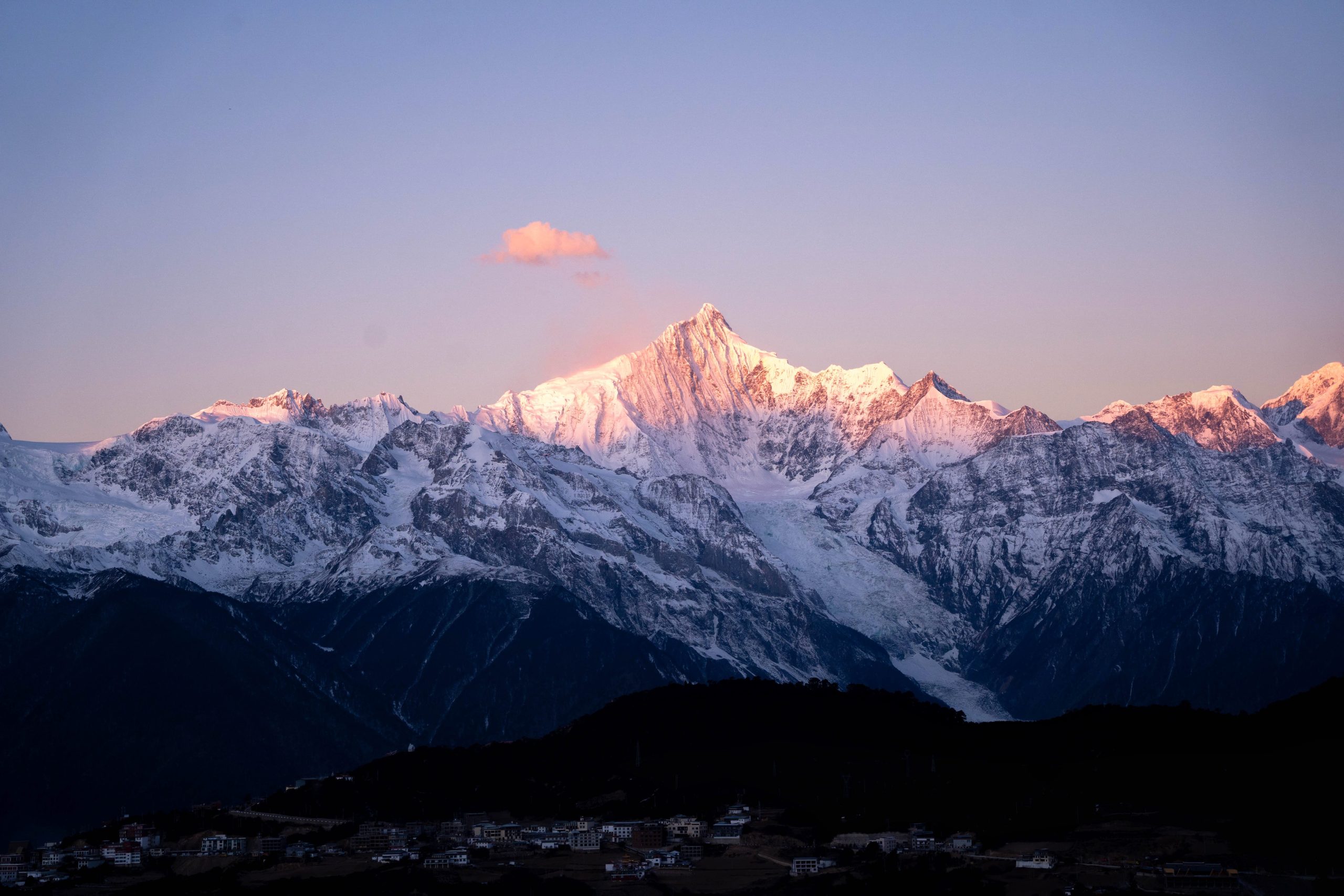 太陽の最初の光が、梅里雪山の頂に触れた瞬間。雪山が、まるで内側から光を放つように、金色に輝き始めたんです。
