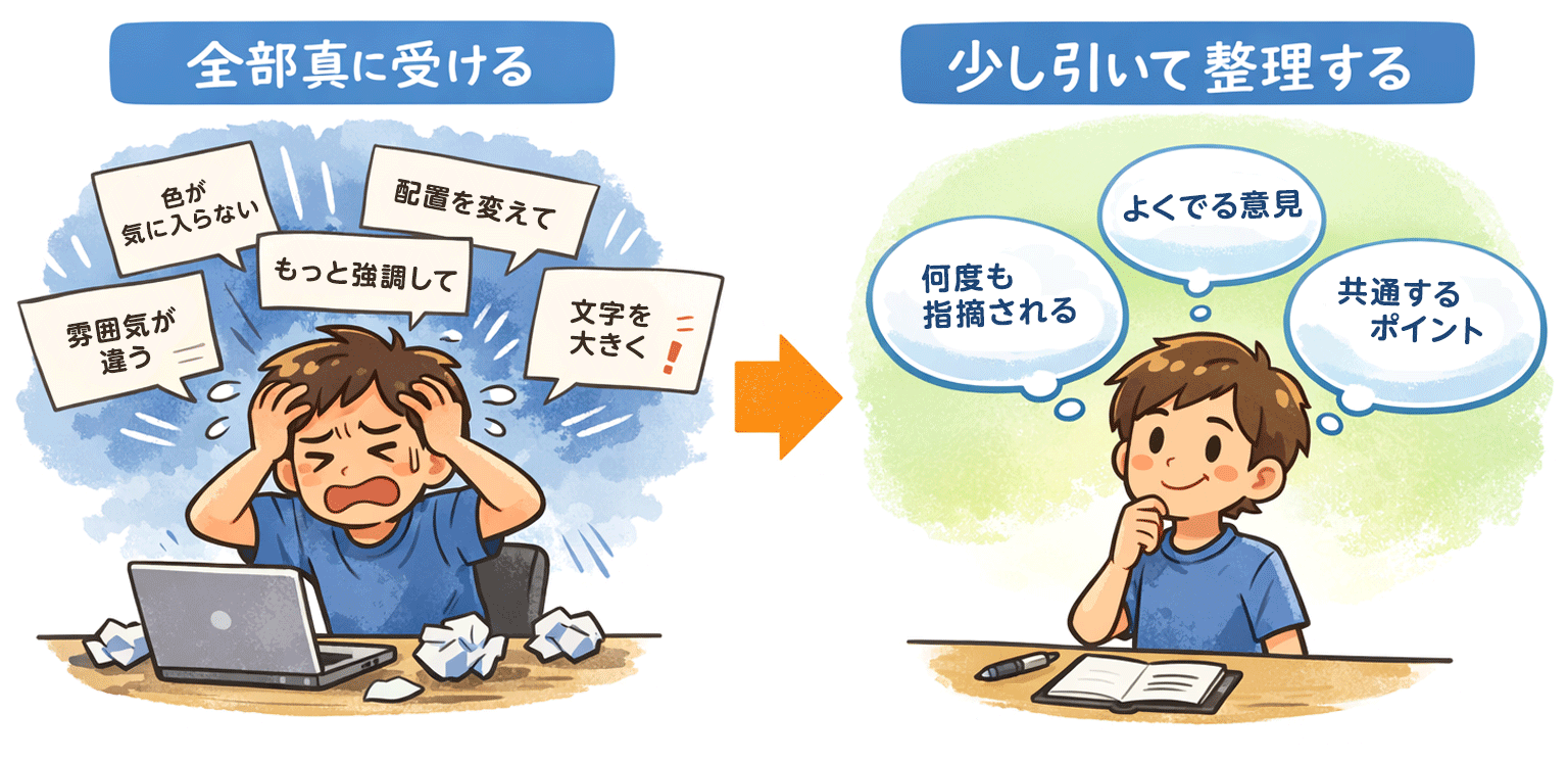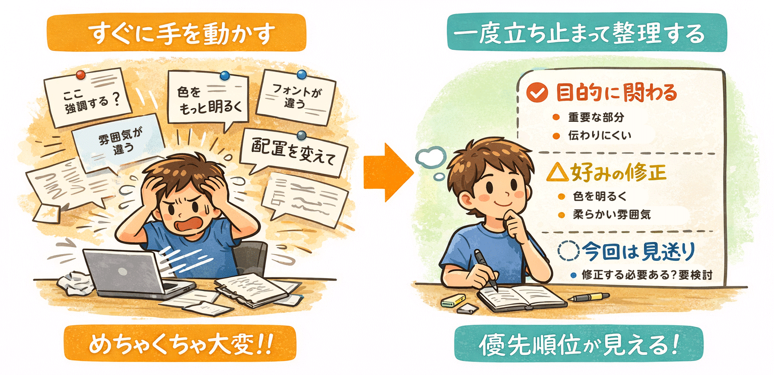 修正内容を見て、一つひとつに全力で反応してしまうと、心も時間も消耗します。