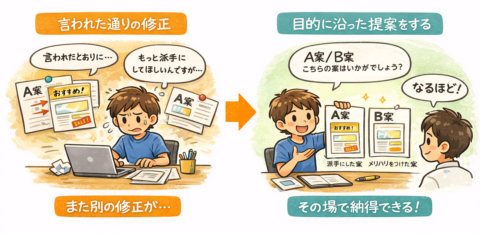 目的に沿った形で提案できると、修正の回数が減ることもあります。