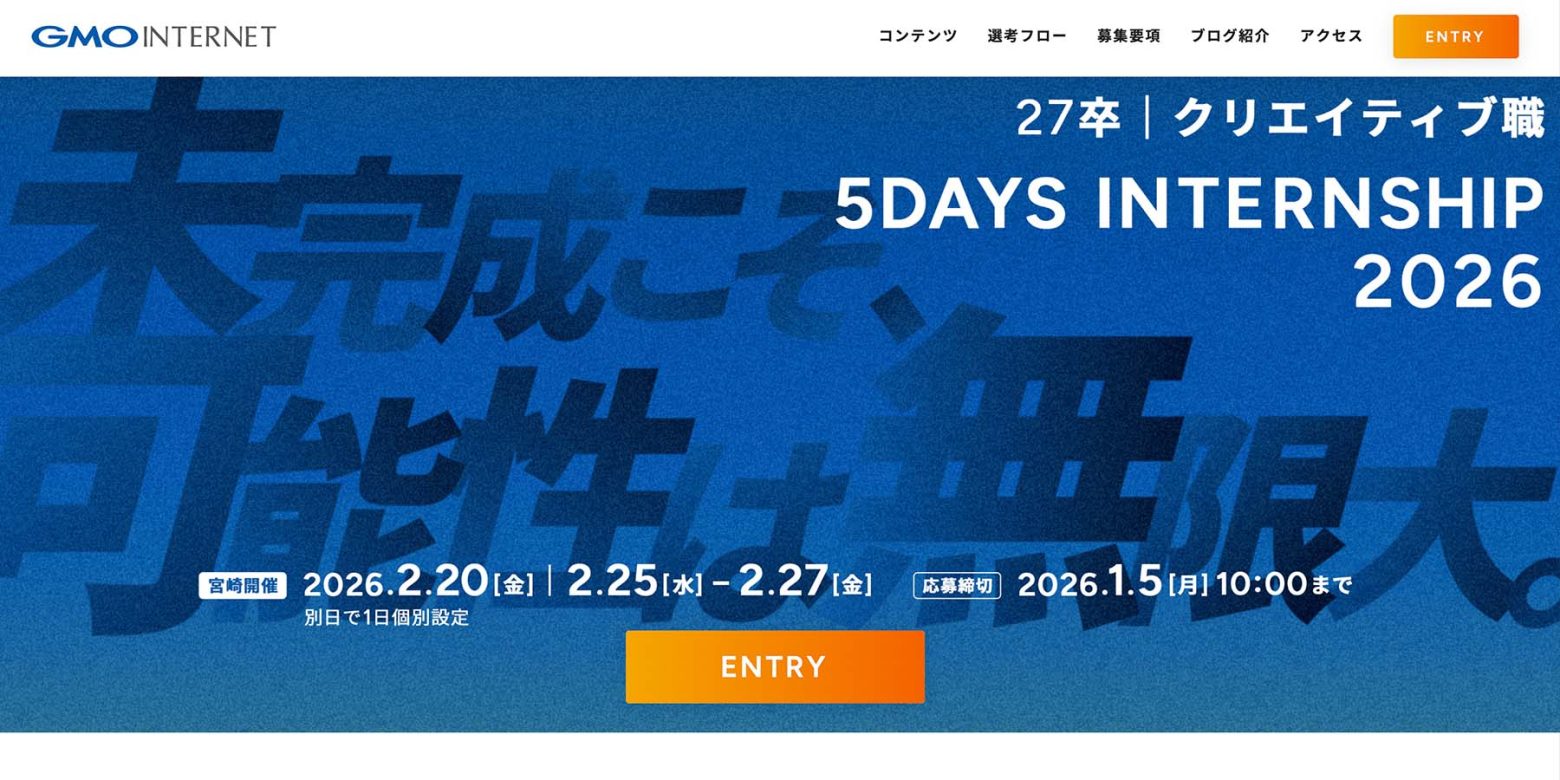 | 日程 | Day1:2026年2月20日(金)10:00~13:00(オンライン) Day2:2026年2月25日(水)10:00~19:00(宮崎オフィス) Day3:2026年2月26日(木)10:00~19:00(宮崎オフィス) Day4:2026年2月27日(金)10:00~21:00(宮崎オフィス) Day5:2026年3月上旬:個別相談会(1時間程度)(オンライン) ※個別相談会ではポートフォリオ添削も実施予定です。 |